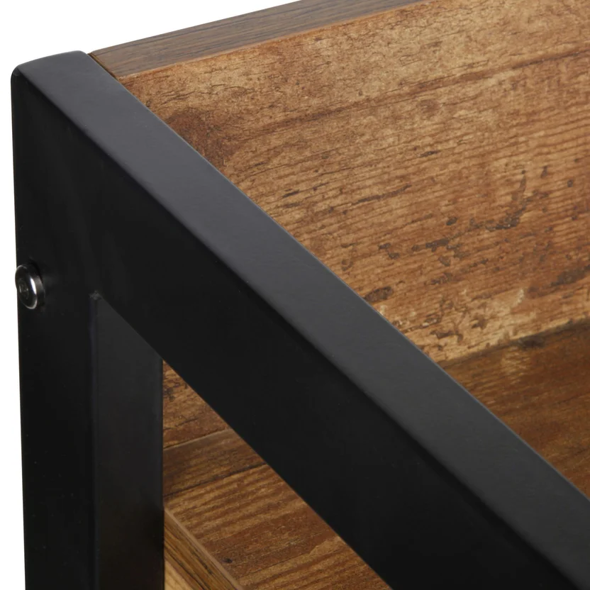 Escritorio Rockford Walnut, estilo vintage-industrial con superficie de melamina, dos cajones integrados y montaje fácil. Perfecto para home office con personalidad.