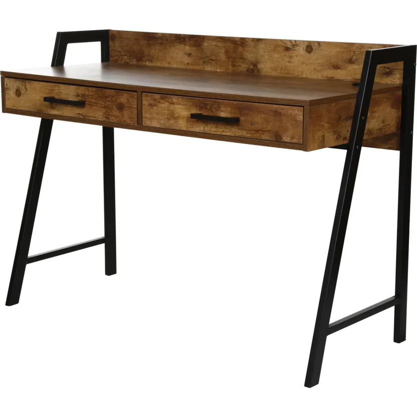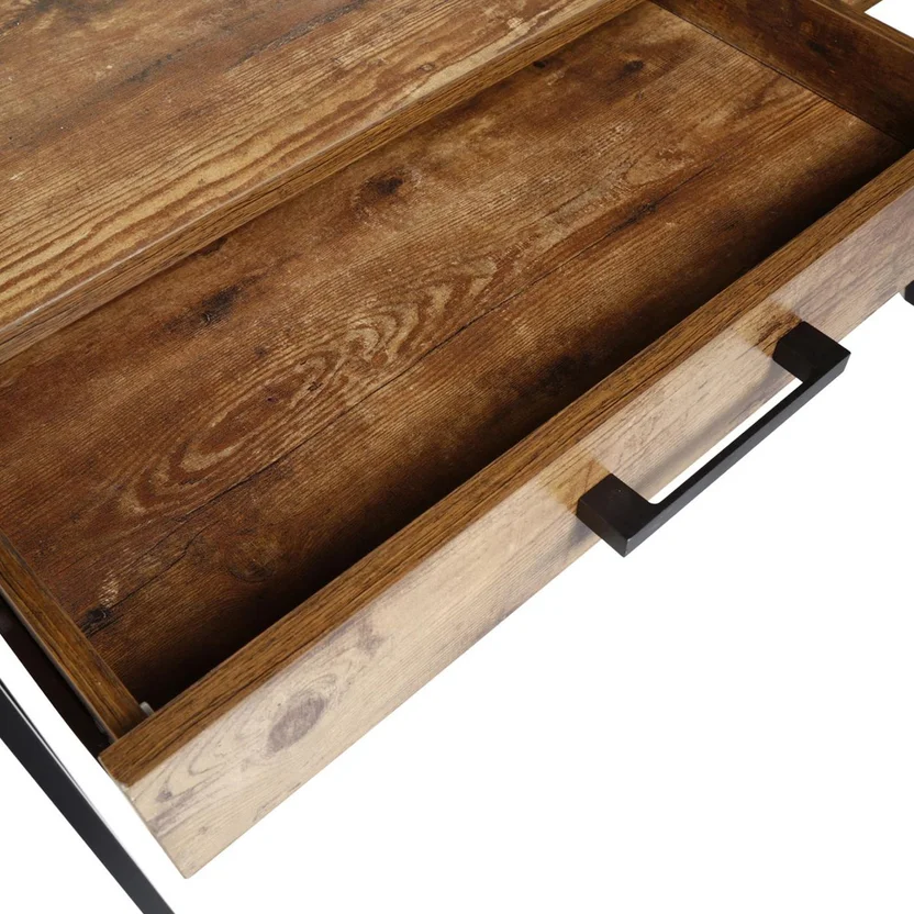 Este modelo destaca por su estilo industrial con toques vintage, reflejado en el uso de melamina y detalles metálicos que realzan su diseño retro-elegante. Viene equipado con dos cajones amplios integrados en toda la longitud de la mesa, ideales para guardar documentos, artículos de papelería o accesorios a mano sin saturar el espacio.