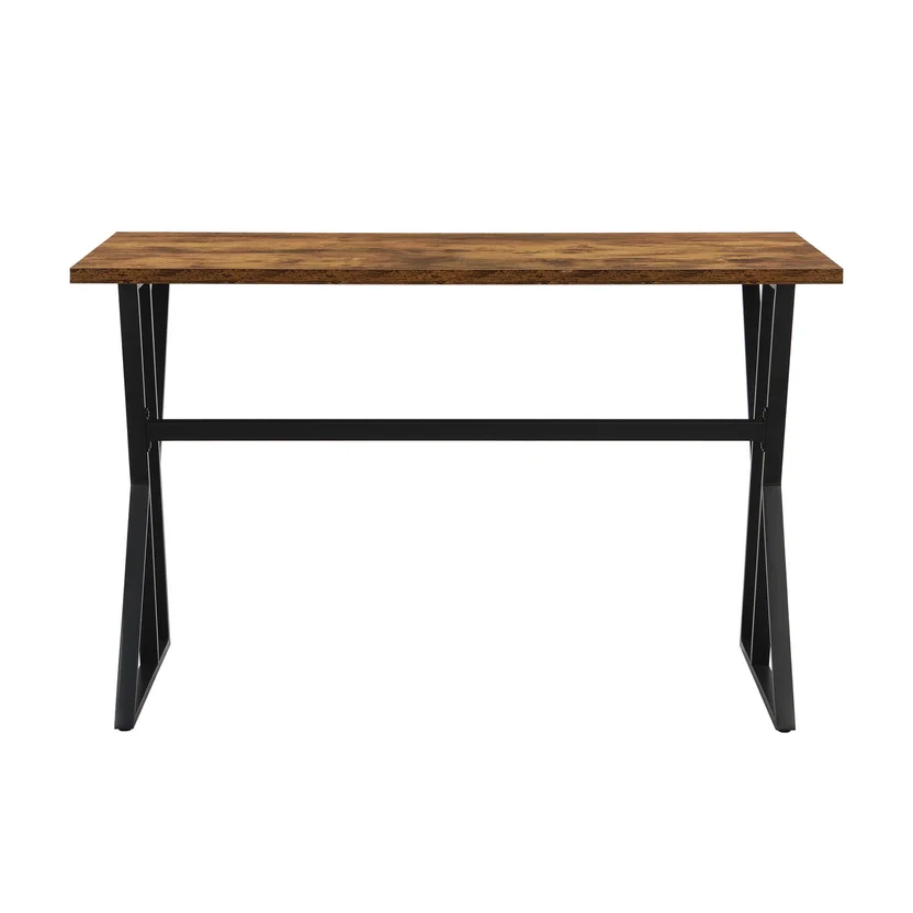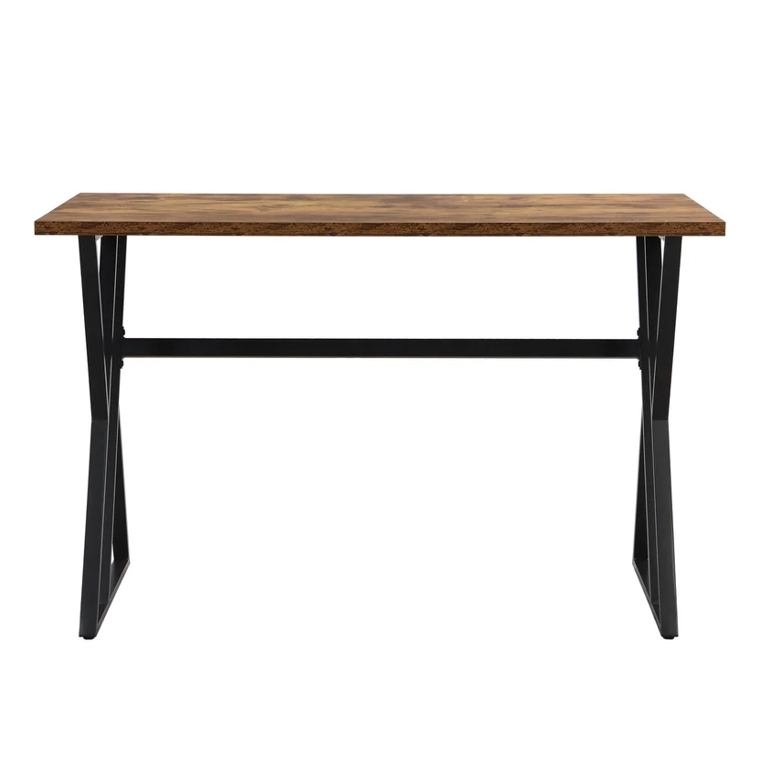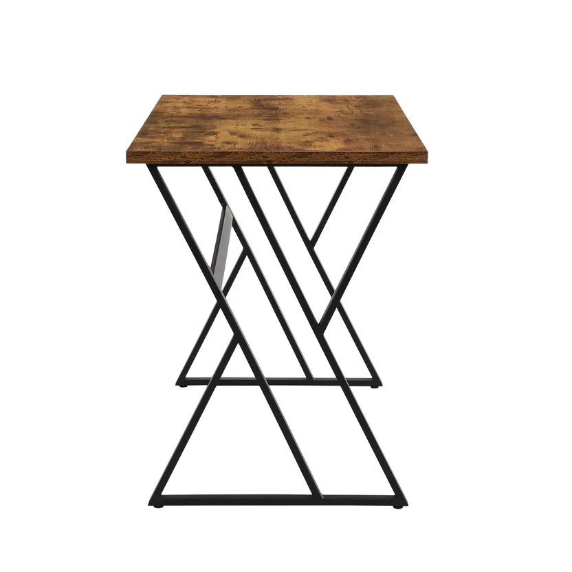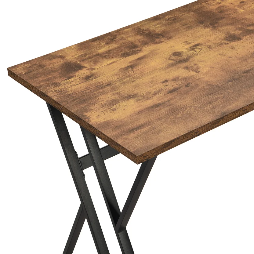 Su diseño combina una superficie estilo madera en tono marrón oscuro con una estructura metálica negra, creando ese estilo industrial moderno que tanto se busca en ambientes contemporáneos.