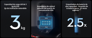 Estabilizador profesional 3 ejes con algoritmo RS de última generación, pantalla OLED táctil con bloqueo automático, batería de 12 h y carga rápida, diseñado para cargas de hasta 3 kg.