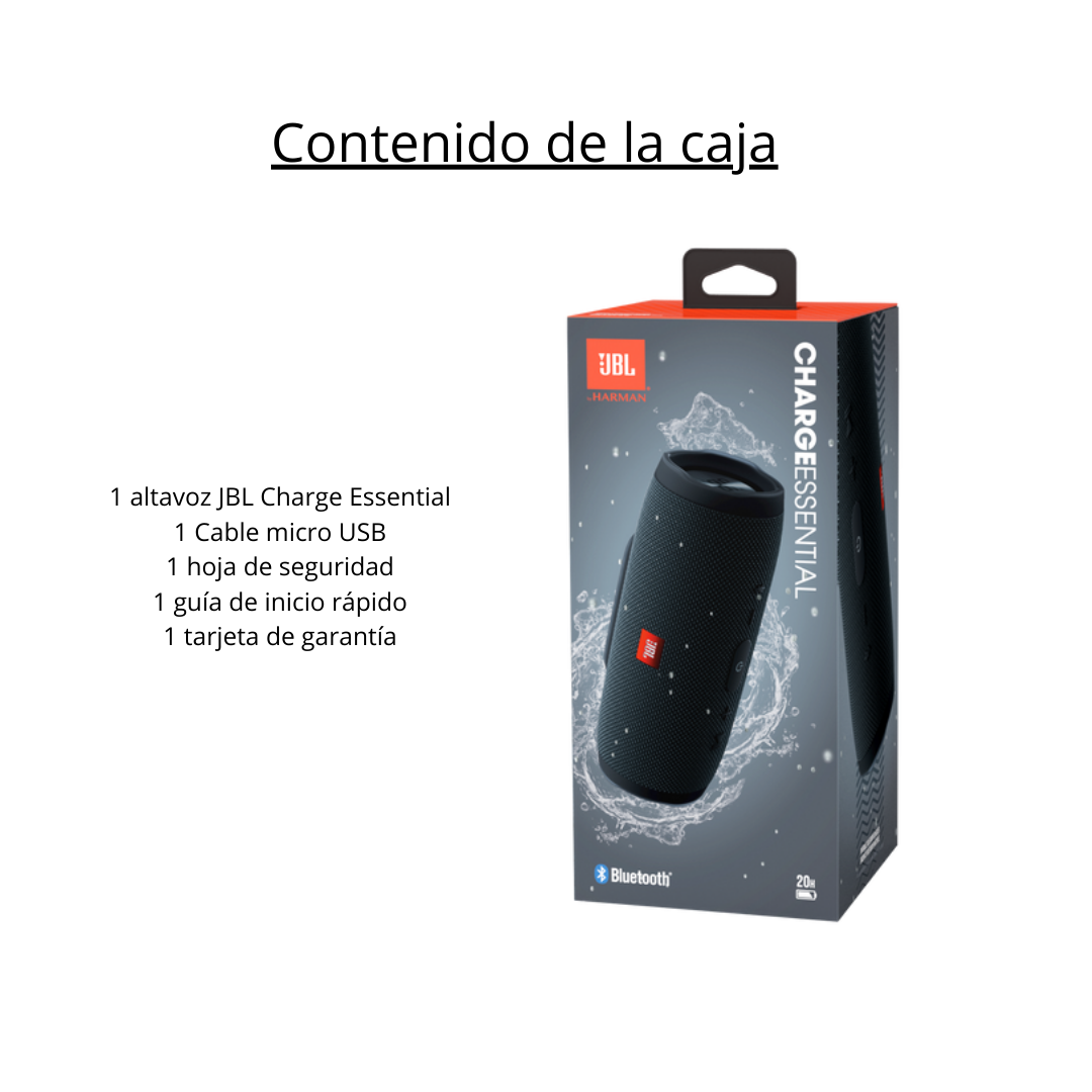Contenido del envío: 1x JBL Altavoz Charge Essential Portátil con Bluetooth resistente al agua IPX7, cable micro USB, hoja de seguridad y guía de inicio
