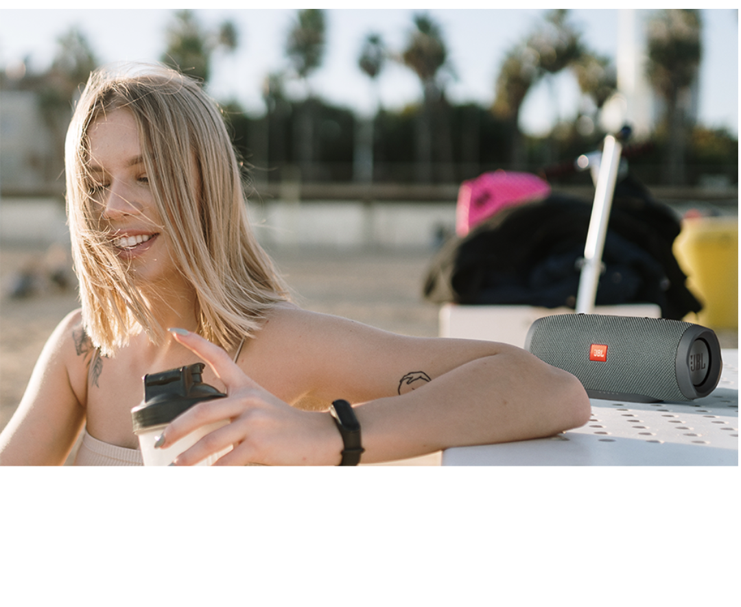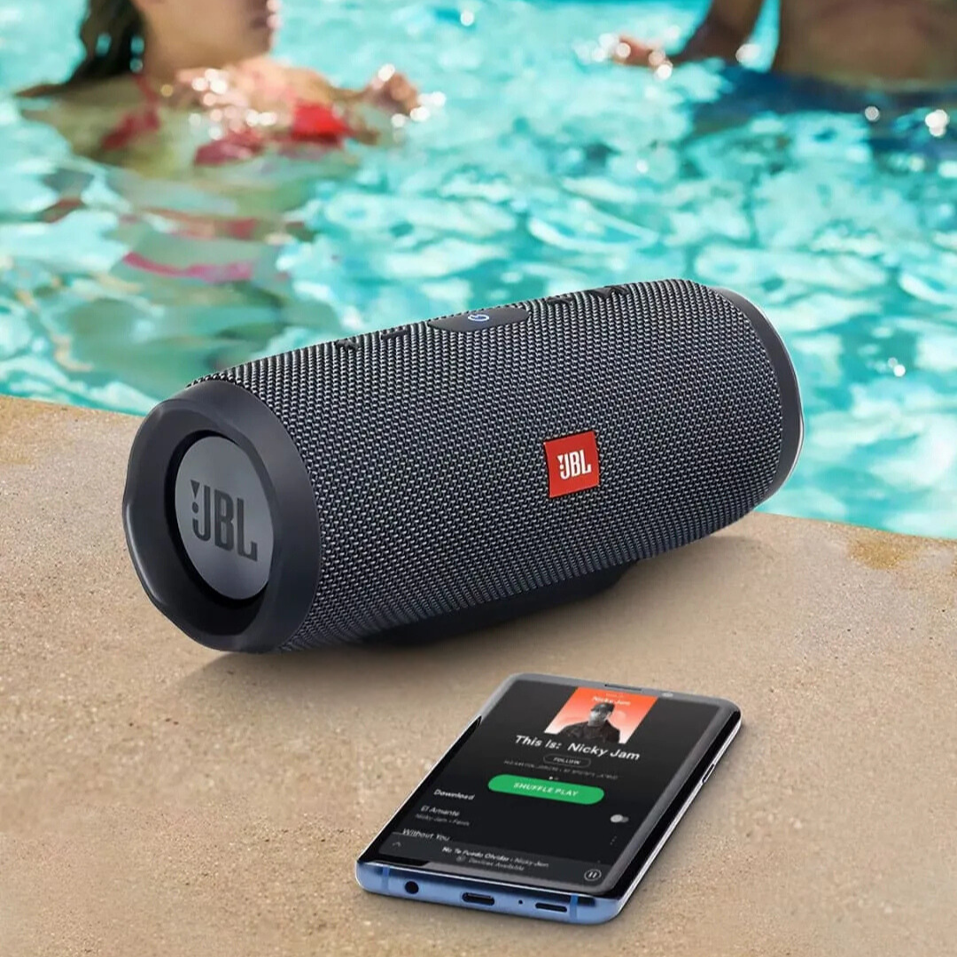 Lleva tus altavoces allá donde quieras. ¿Fiesta en la piscina? ¡Perfecto! ¿Un chaparrón inesperado? Sin problema. ¿Un día de playa? El JBL Charge Essential es resistente al agua conforme a la norma IPX7 para que disfrutes al aire libre sin preocupaciones