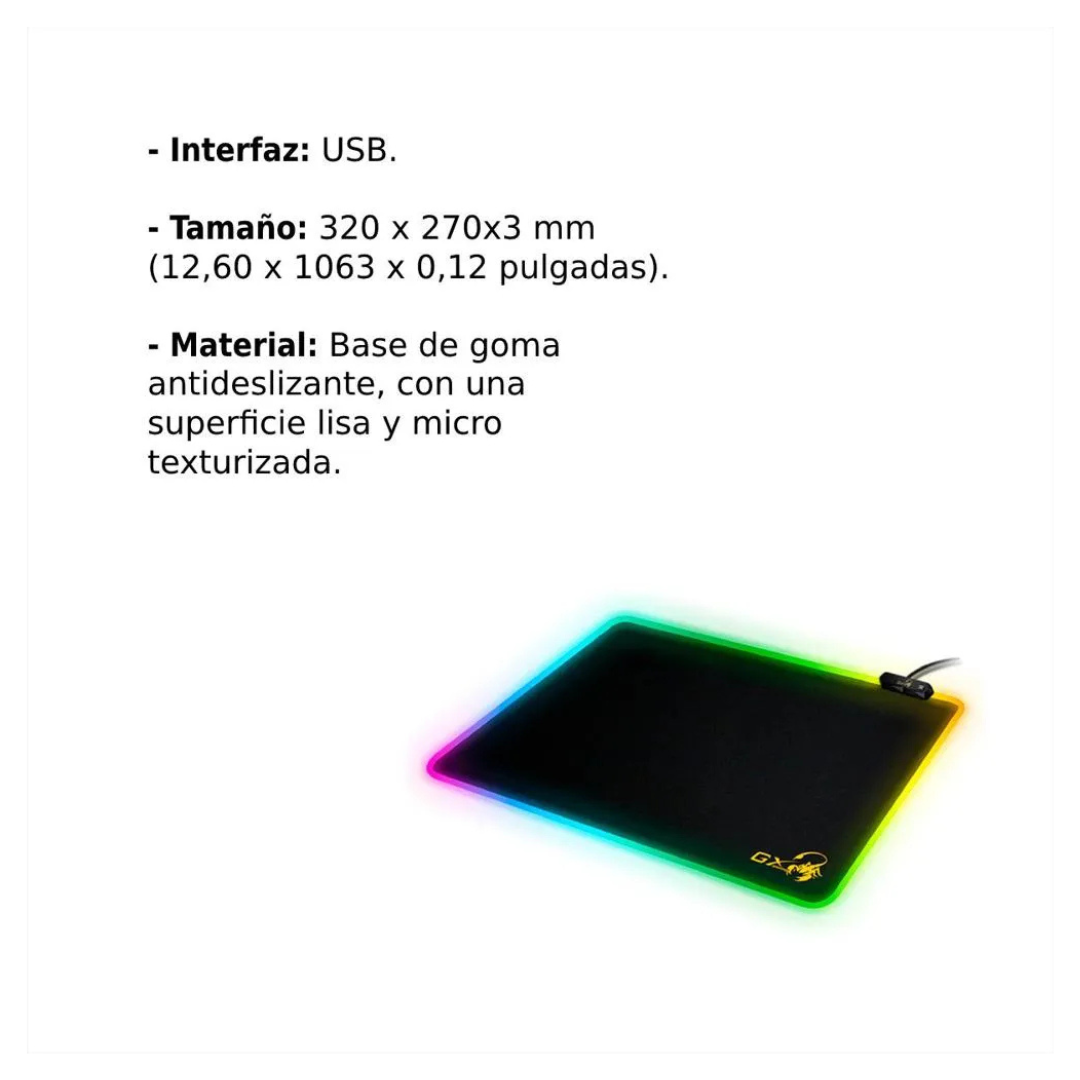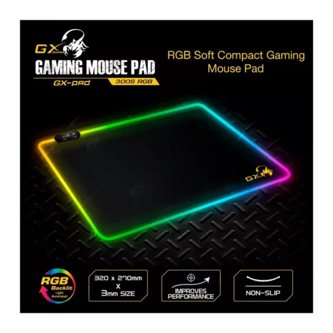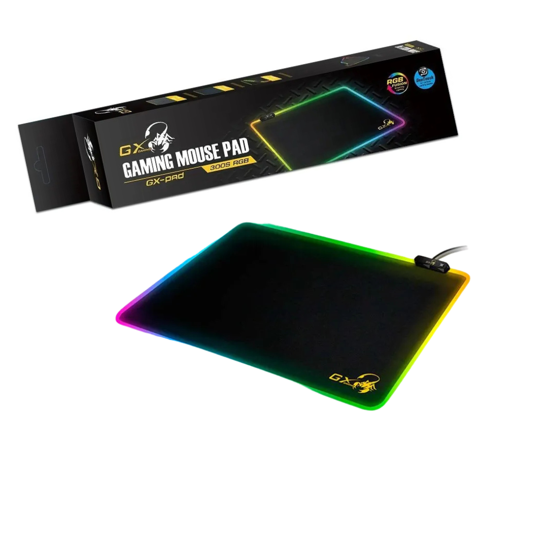 Genius Gaming Mouse Pad GX-Pad 300S RGB ilumina tu entorno de juego y te ofrece una sincronización competitiva para el campo de batalla. El tamaño compacto es liviano y fácil de transportar. Con sus magníficos efectos visuales y perfiles de iluminación, el GX-Pad RGB implementa una superficie ultra lisa que desbloquea la precisión refinada y el objetivo de precisión suprema.